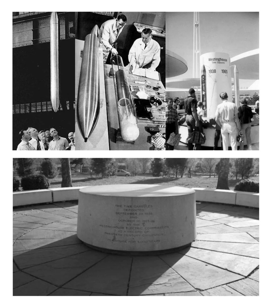 放置时间舱的概念来自于1938。为了给1939年的纽约世博会一份特别的礼物,美国总统罗斯福邀请爱因斯坦用特制的纸张和墨水,5000年后的人类写下了《致后人书》。这封信与凝聚着20世纪上半页人类智慧的诸多器物被放置于一个特质容器内埋入地下,等待5000年后人们再挖掘出来研究。