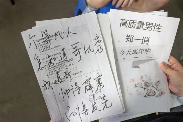 今年3月17日,郑一逍18岁生日这一天,全班同学每人给他画了一幅“逍”像画,附上祝福的话语,厚厚的40页纸汇成了一本特殊的生日册。有人写道:“尔等凡人,怎知道我逍哥优秀!”“首考失利,但相信你的实力,一定会在6月的考场绽放。”还有人把他画成像绿巨人一样的肌肉男。“真的超级感动!”郑一逍说,翻看册子的时候,能感到沉甸甸的期待与鼓励。